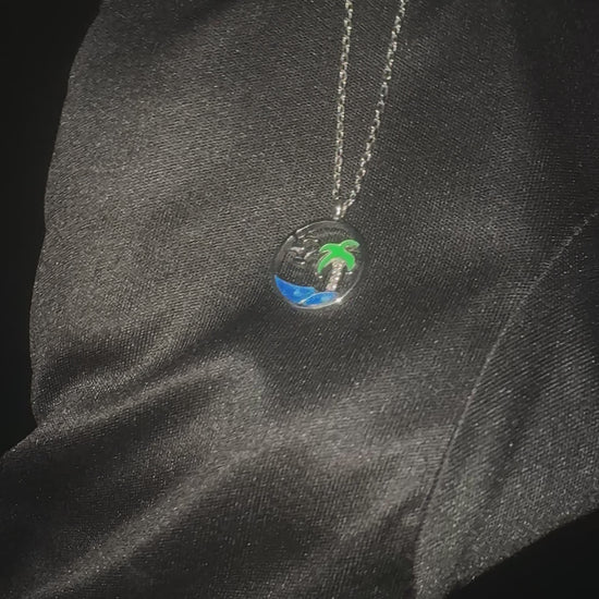 Circular pendant showcasing a detailed island scene with palm trees, sea, and birds