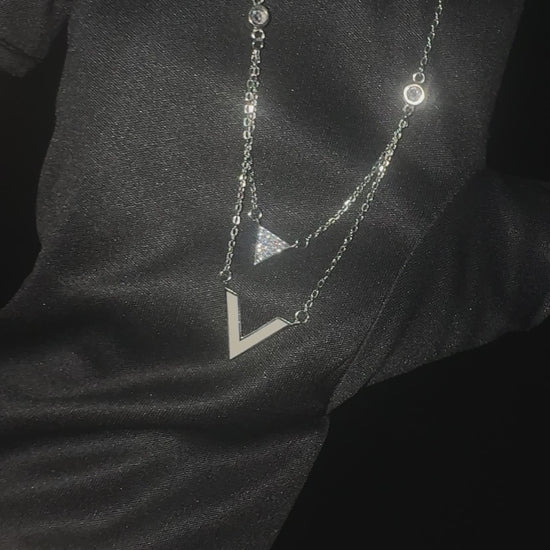 Silver Layered V Shape Pendant showcases a contemporary double pendant design: a polished V shape forms the base, while a sleek triangle set with shimmering zirconia stones adds a delicate accent above. This artistic composition brings modern sophistication to any look.
