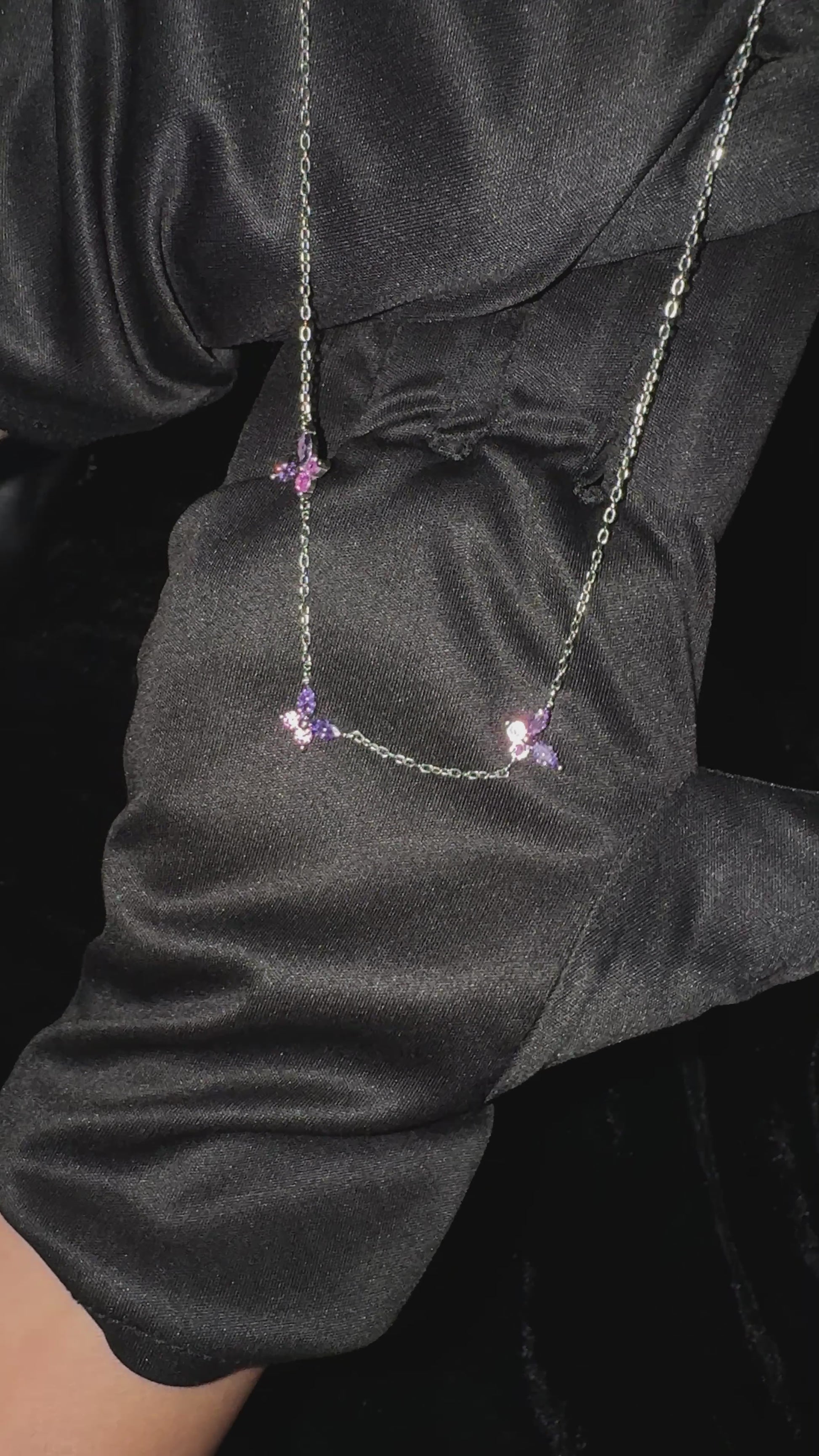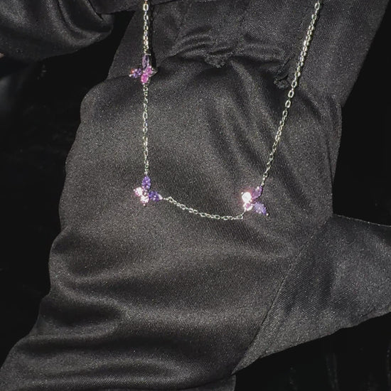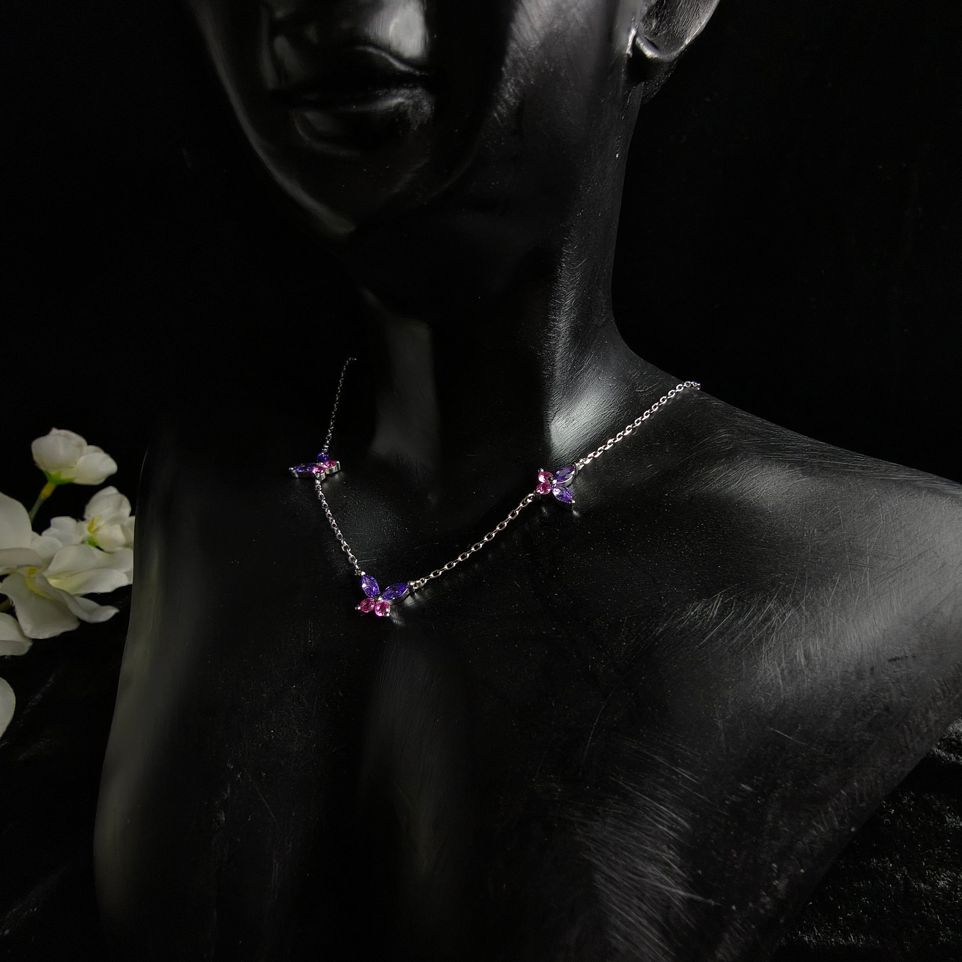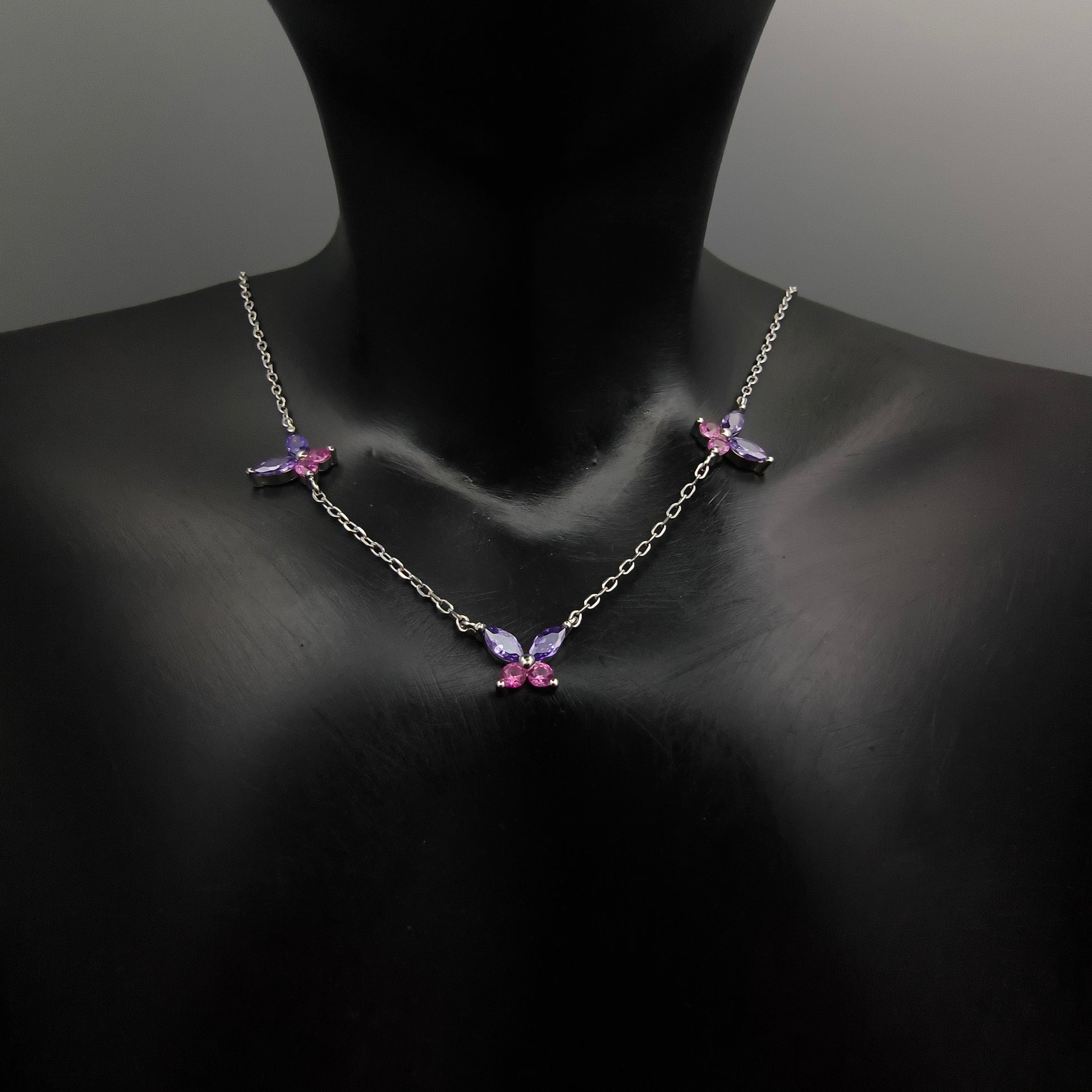 Discover delicate charm and feminine grace with the Silver Lilac Wings Necklace. This exquisite piece features a fine sterling silver chain adorned with three beautifully crafted butterfly charms, each embellished with sparkling lilac-hued cubic zirconia stones. The soft lilac tones and intricate detailing evoke a sense of whimsy and elegance, making it a perfect accessory for those who love a touch of color and nature-inspired beauty. Lightweight and anti-tarnish, this necklace promises lasting shine and comfort, ideal for everyday wear or special moments.