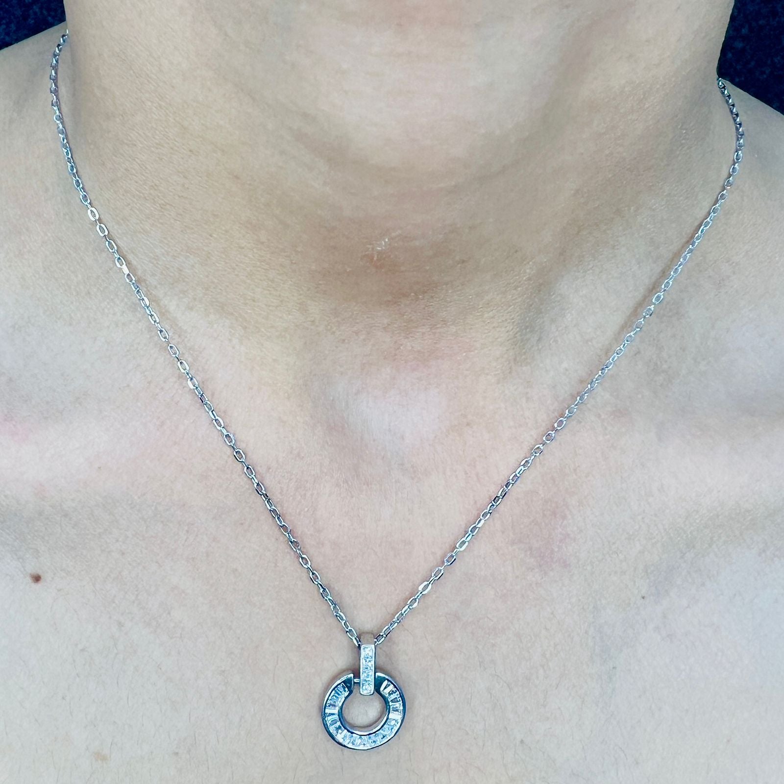 The pendant features a modern hollow round shape with the inner circle fully embellished with high-shine zircon stones, giving it a soft yet luxurious sparkle.