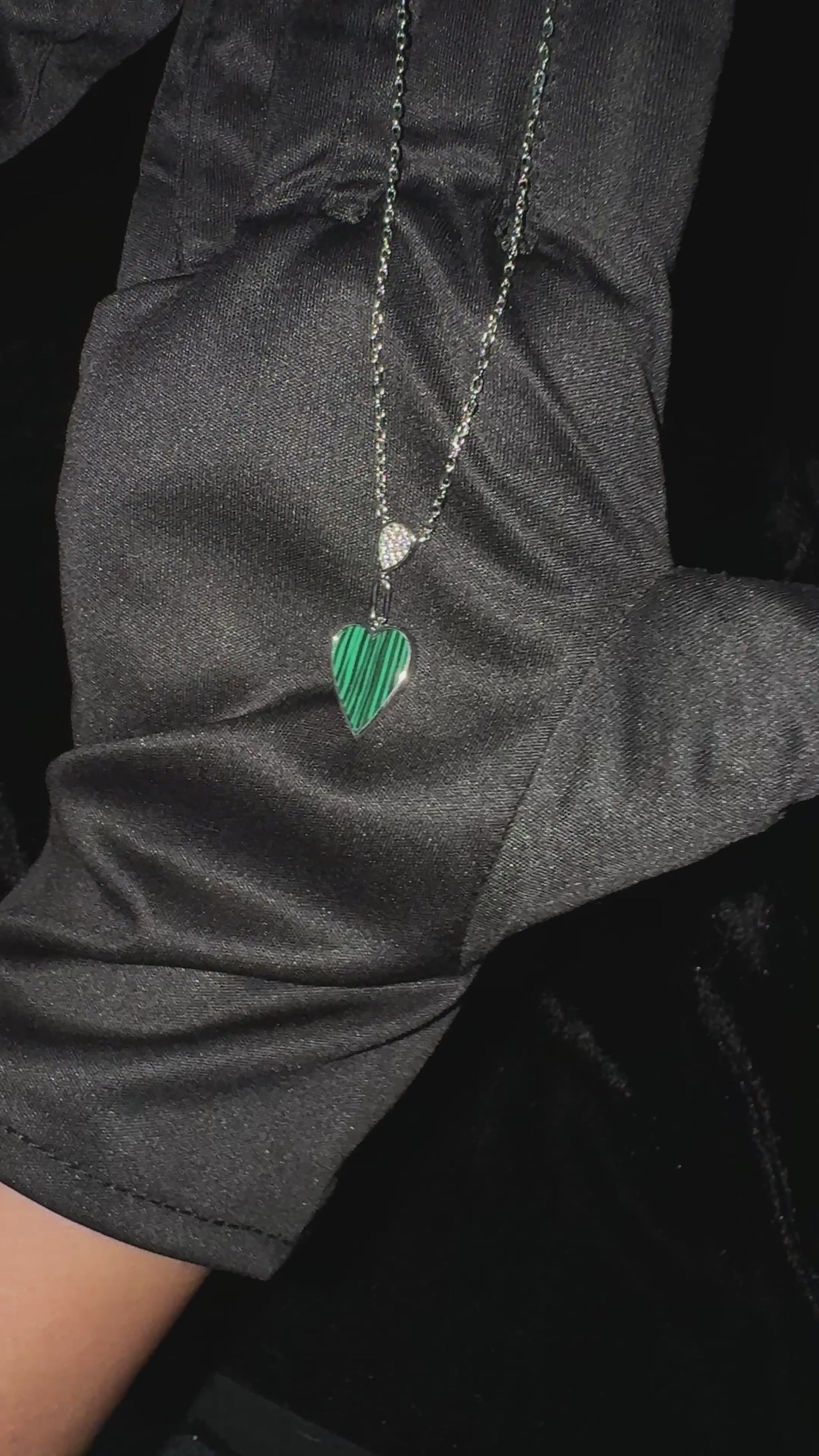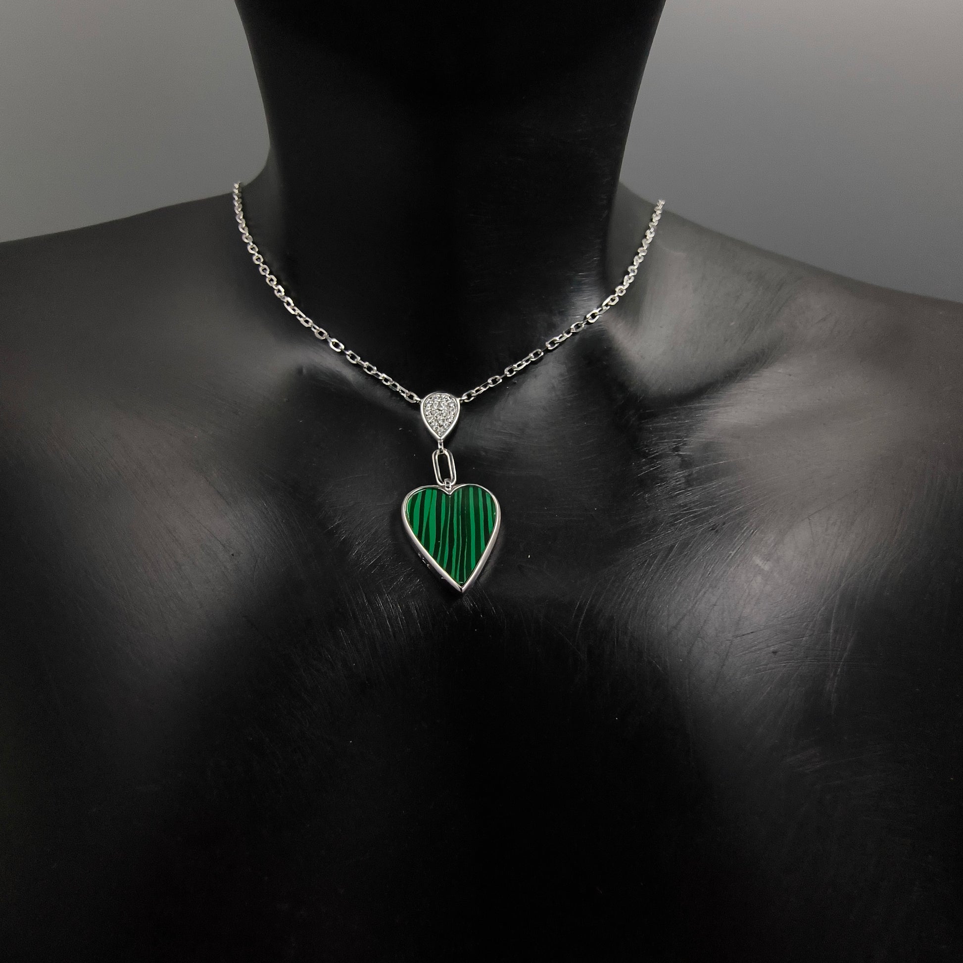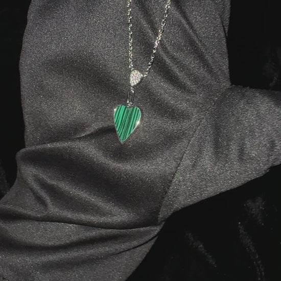 Silver Malachite Heart Necklace is beautiful and stylish, featuring a heart-shaped pendant filled with rich green malachite stone. Just above the heart is a small teardrop charm with tiny sparkling stones that add a nice shine.