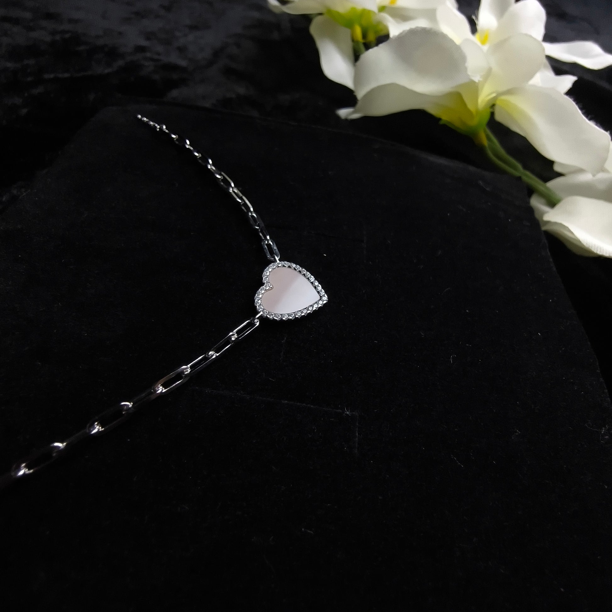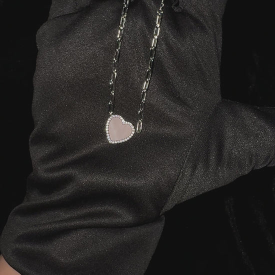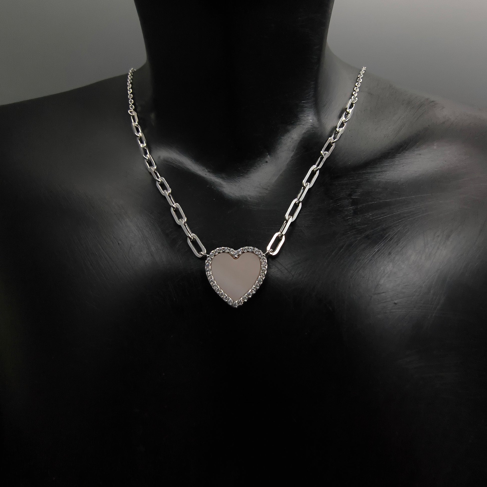 Silver Milky Quartz Heart Necklace is soft and elegant, featuring a light neutral-toned heart pendant that resembles a milky wave. The heart is beautifully outlined with sparkling stones, adding a touch of shimmer and sophistication to the design.