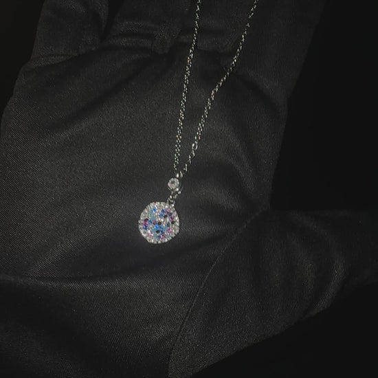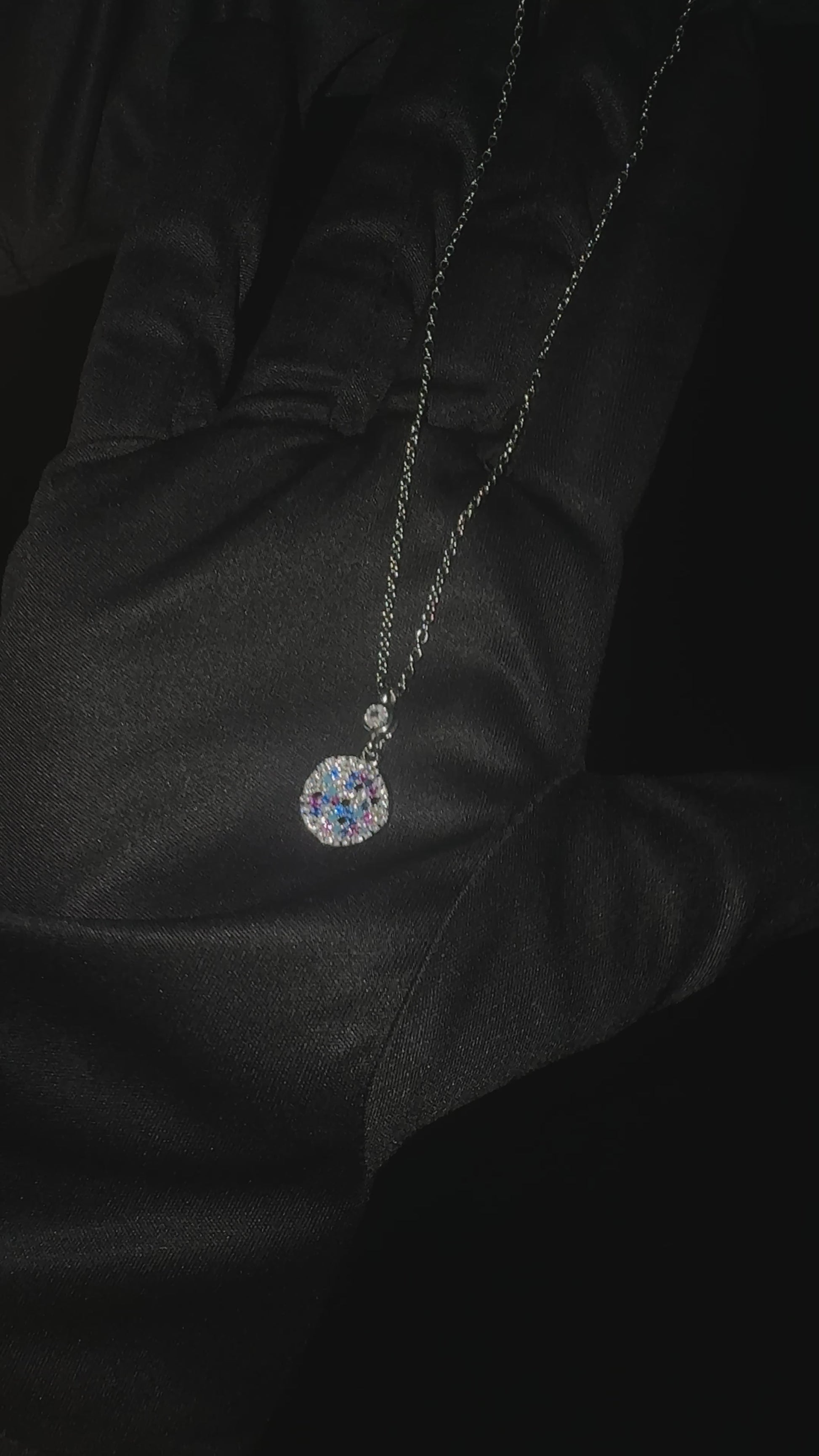 Silver Multicolour Disc Pendant features an elegant, softly rounded disc-shaped pendant adorned with vibrant multicolor zirconia stones. A small sparkling diamond sits just above the disc, adding an extra touch of brilliance and sophistication.