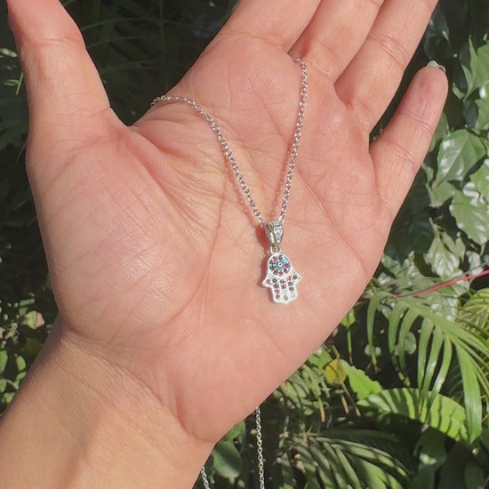 Silver Mystic Hamsa Pendant showcases the iconic Hamsa hand symbol centered with a traditional evil eye, designed to offer protection while making a bold style statement. The pendant is adorned with vibrant multicolored enamel and delicate micro pave stones that sparkle exquisitely, blending ancient symbolism with modern elegance.