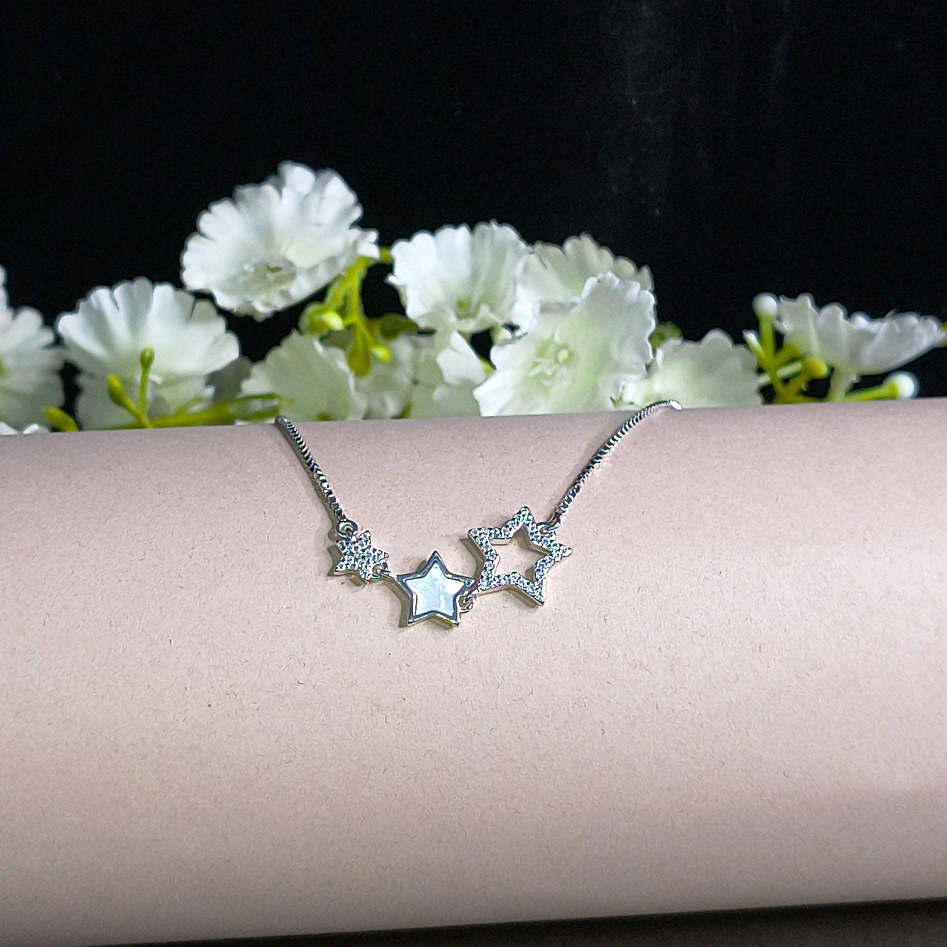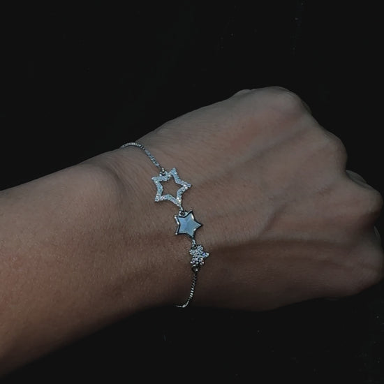 Shine bright with the Silver Star Cluster Bracelet, a playful yet elegant piece for every occasion. It features a trio of stars—a bold dark silver star nestled between a smaller sparkling star and a dazzling open-cut star—creating a modern, layered look that catches the light beautifully. Made from 925 sterling silver, this bracelet is skin-friendly and anti-tarnish, so you can wear it day or night without worry.