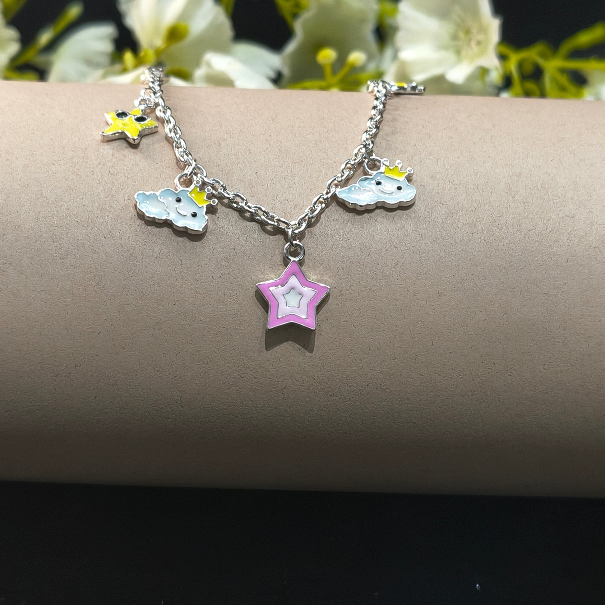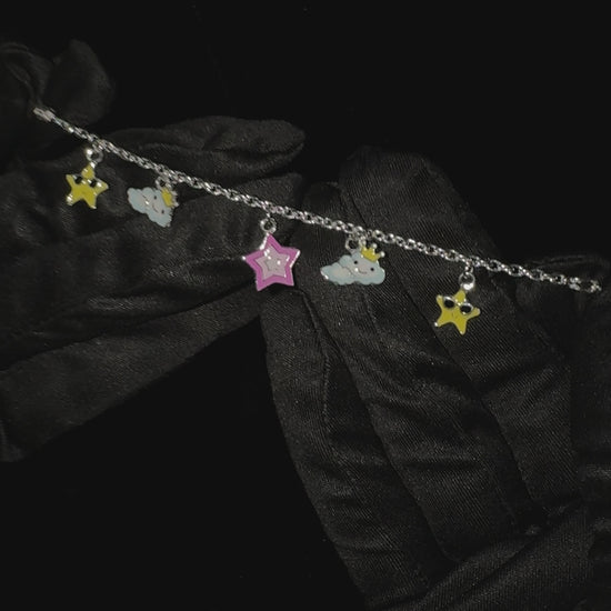 Gift a piece of the night sky with the serene Silver Stars & Clouds Baby Bracelet. Crafted from premium, hypoallergenic 925 Sterling Silver, this piece features charming little star and cloud charms, symbolizing hope and peaceful dreams, making it a wonderful piece of first jewellery.