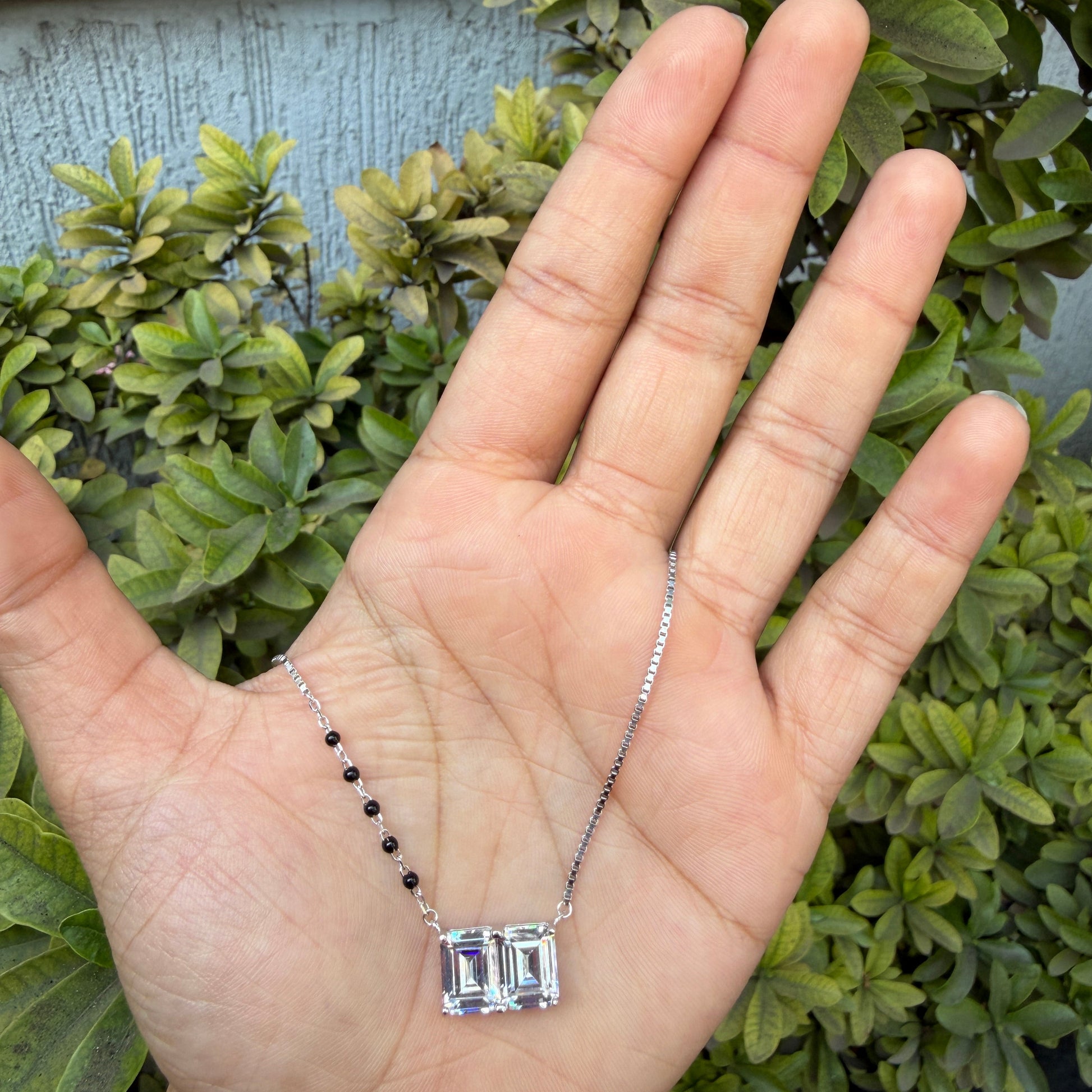Blend tradition with elegance with the Silver Twin Diamond Mangalsutra, meticulously crafted from premium 925 sterling silver. Featuring a twin sparkling white stone pendant accented with classic black beads, this mangalsutra embodies a perfect harmony of modern style and timeless tradition. Designed to be anti-tarnish and skin-friendly, it offers lasting shine and comfort for sensitive skin. A versatile piece, it is ideal for daily wear, weddings, festivals, or gifting, making it a meaningful addition to any jewellery collection.