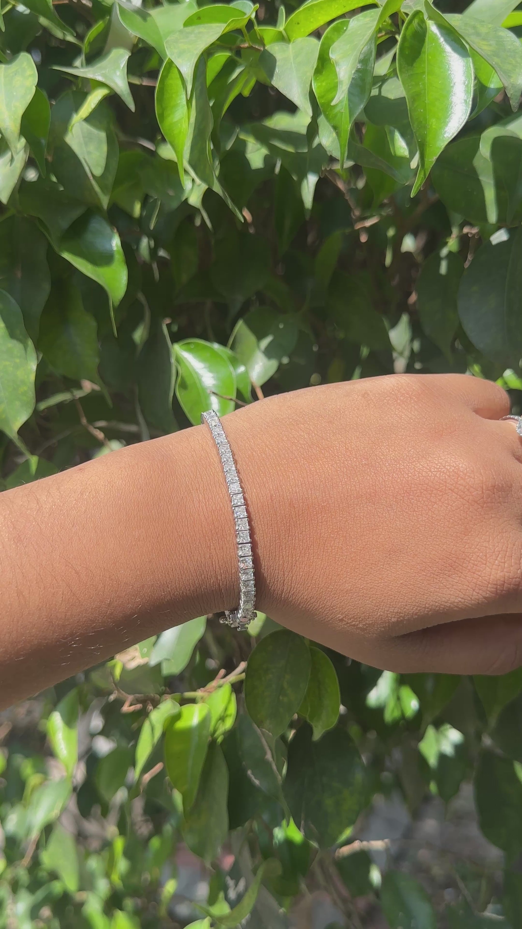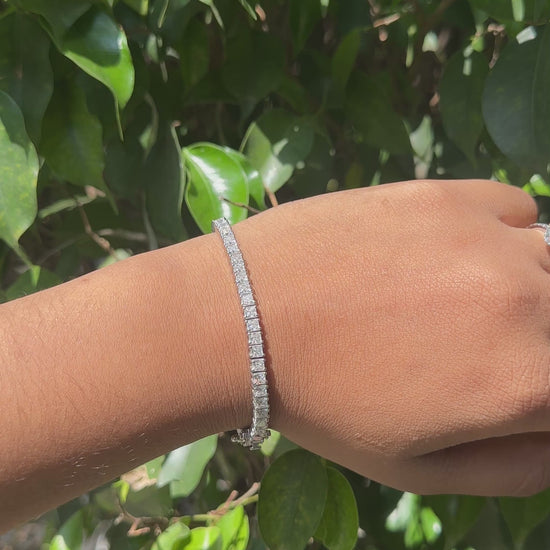 A brilliant, continuous stream of classic round Moissanite stones, set closely in bright 925 sterling silver for maximum light return. This essential tennis bracelet delivers unmatched, high-energy sparkle and a fluid drape that makes it comfortable for endless wear. Designed for people who love sleek, minimal bracelet designs, the Silver Velocity offers both understated elegance and dazzling brilliance. Stone Size: 2mm; Length: 7 Inches