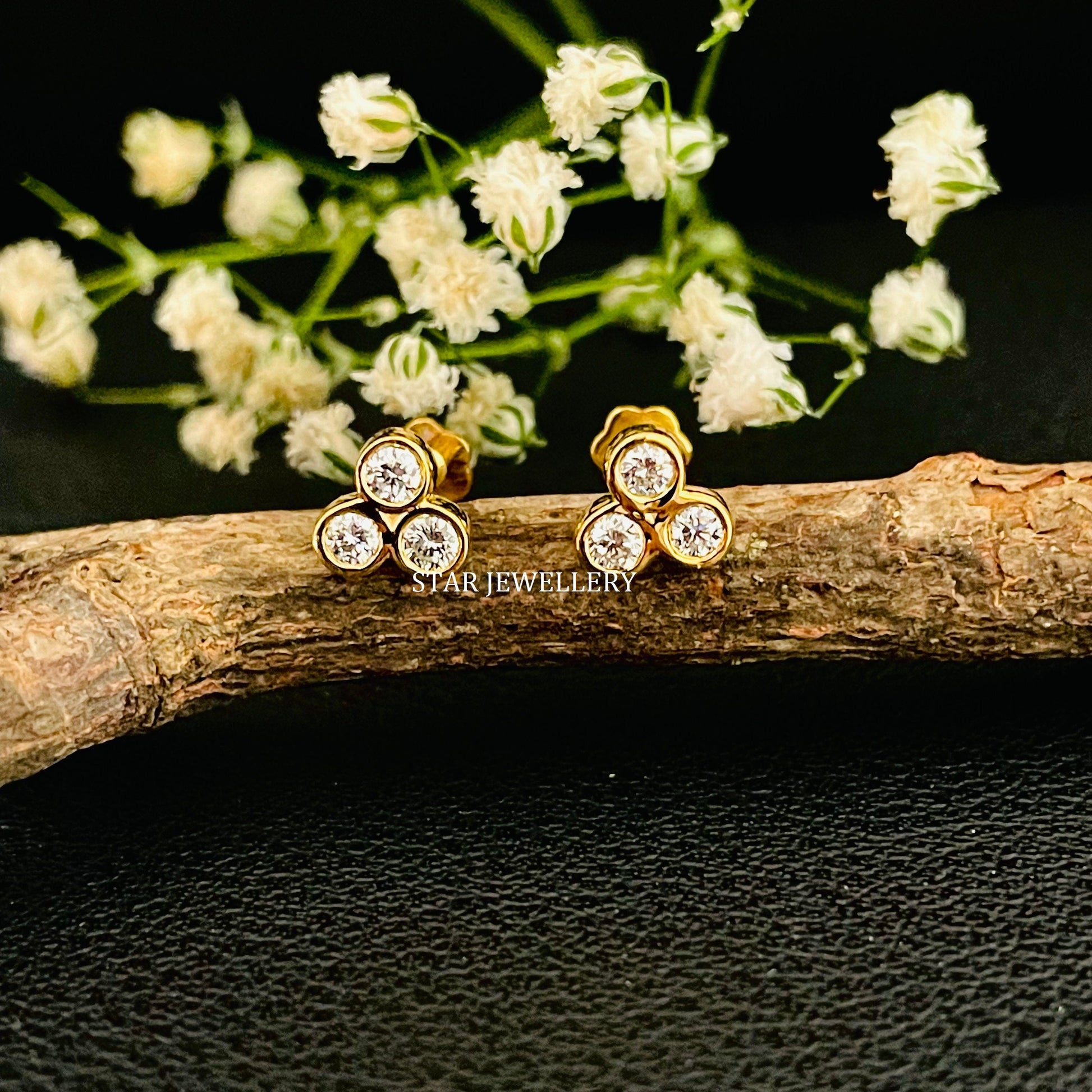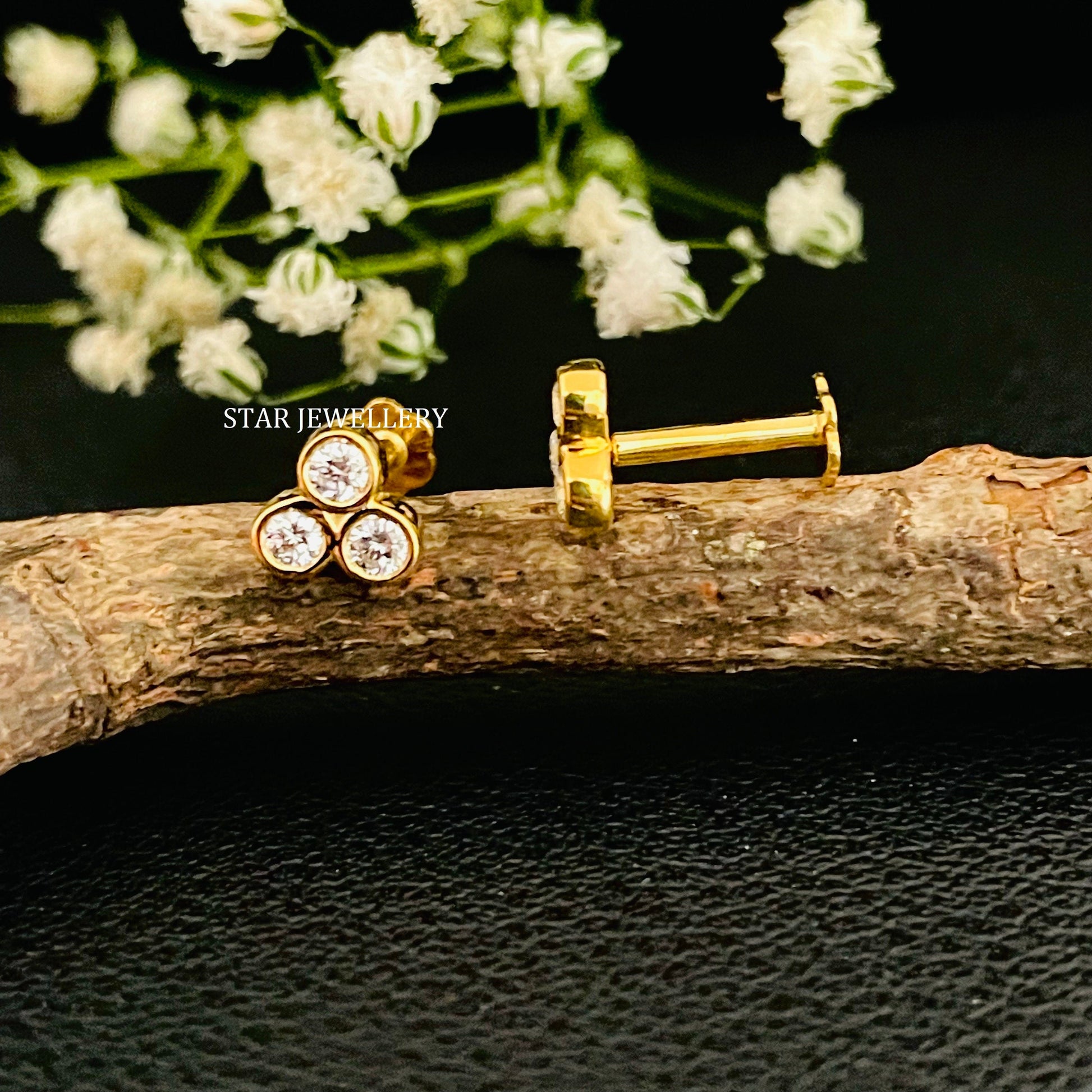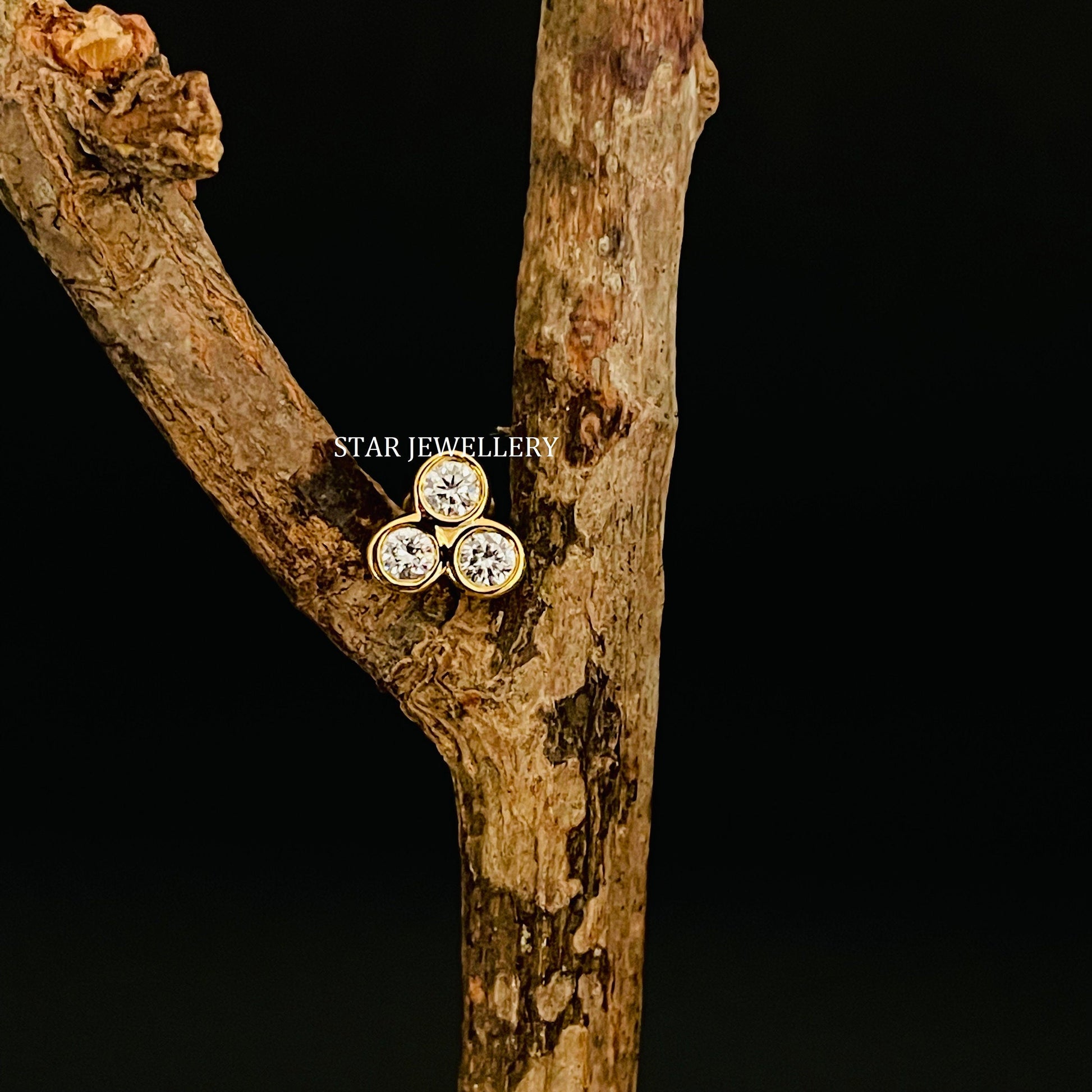 Three Stone Genuine Bezel Set Diamond 14K Gold Earring, Three Stone Bezel Set Diamond Piercing for Conch, Helix, Ear lobe, Rook, Tragus